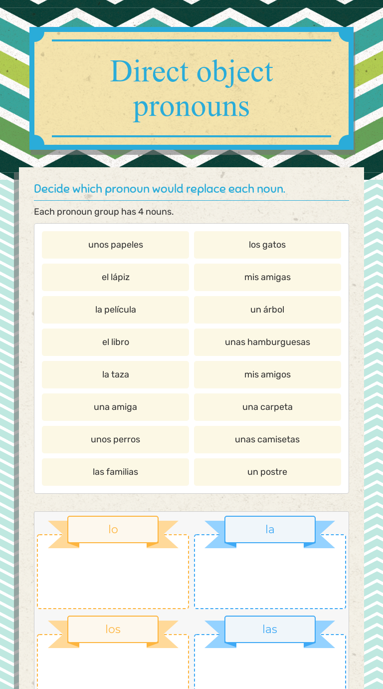 Direct Object Pronouns In Spanish | How To Use Them Well While in English they are placed after the verb, in Spanish this pronoun is placed in front of the verb. Let's take a look at some helpful examples. Remember the direct object (noun) can be a person, a thing, or a noun phrase. Pepe besó a Lisa. => Pepe la besó. Juan cocinó la torta. => Juan baked the cake. Juan la cocinó. => Juan baked it. Direct Object Pronouns exercise - Liveworksheets ID: 1681905 Language: Spanish School subject: Español como Lengua Extranjera (ELE) Grade/level: Grade 5 Age: 10-18 Main content: Direct Object Pronouns Other contents: Add to my workbooks (2) Download file pdf Embed in my website or blog Add to Google Classroom Indirect Object Pronouns - The Spanish Dude Once you know your direct object pronouns in English, you're done. Direct and indirect object pronouns in English are exactly the same. But not in Spanish. Oh no. So… You can't just say "him" or "her" or "them" when you're talking. In today's video, not only will I explain what the heck direct and indirect objects are (I had no idea either!) But you'll quickly see how ... Direct Object Pronouns - StudySpanish.com In an affirmative statement with one verb, the direct object pronoun comes immediately before the conjugated verb. Tengo = I have Tengo la pluma. = I have the pen. La tengo. = I have it. The pronoun (la) comes immediately before the verb (tengo). Notice that if the subject of the sentence changes, this does not affect the direct object pronoun.