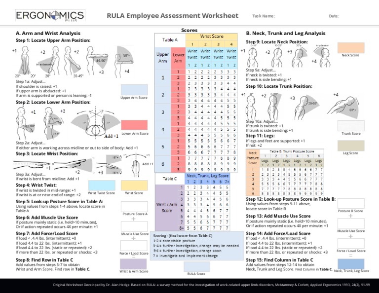 RULA Employee Assessment Worksheet | PDF | Arm - Scribd RULA Employee Assessment Worksheet. A. Arm and Wrist Analysis Step 1: Locate Upper Arm Position: +1 +2 +2 based on RULA: a survey method for the investigation of work-related upper limb disorders, McAtamney & Corlett, Applied Ergonomics 1993, 24(2), 91-99