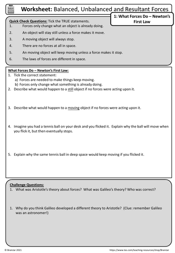Balanced and Unbalanced Forces Worksheet | Teaching Resources pdf, 113.97 KB 3 sides A4 worksheet with answers to support the lesson on Balanced, Unbalanced and Resultant Forces. The questions are the same in my FREE lesson powerpoint which can be found here: