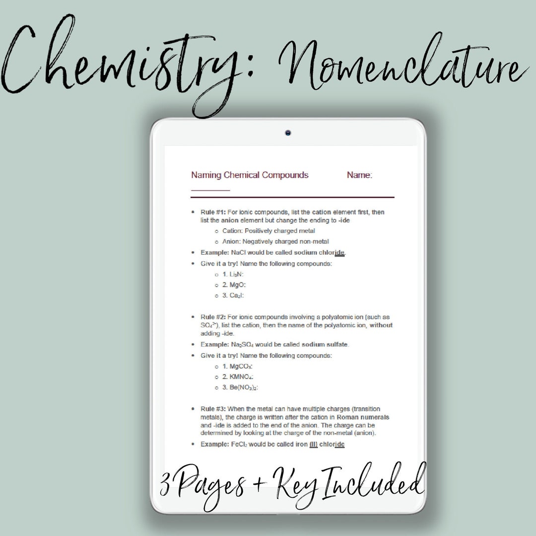 PDF Naming Molecular Compounds Name Chem Worksheet 9-2 - DSA Chemistry A molecular compound is a group of atoms held together by a covalent bond. Compounds made entirely of non-metals are generally molecular compounds. Carbon tetrachloride, CCl 4, is an example of a molecular compound. When naming these compounds prefixes are used to denote how many of each atom is bonded in the compound. However, the prefix mono ... Naming Ionic Compounds Worksheet Pdf With Answers An example is ammonium ion, nh 4 +. Solutions for the naming ionic compounds practice worksheet 1) ammonium chloride 2) iron (iii) nitrate 3) titanium (iii) bromide 4) copper (i) phosphide 5) tin (iv) selenide 6) gallium arsenide 7) lead (iv) sulfate 8) beryllium bicarbonate 9). These worksheets cover chemical names and formulas. Naming Molecular Compounds Worksheet Answers Chemistry If8766 You'll also learn how to answer questions about solid state change. Identifying molecular compounds. A molecular compound is a mixture of two or more elements, usually non-metals. Many compounds are made of neutral molecules and do not contain any ions. On the other hand, covalent compounds are formed when more than one element shares electrons. PDF Naming Covalent Compounds Worksheet Naming Covalent Compounds - Key Write the formulas for the following covalent compounds: 1) Nitrogen tribromide NBr 3 2) hexaboron silicide B 6 Si 3) chlorine dioxide ClO 2 4) hydrogen iodide HI 5) iodine pentafluoride IF 5 6) dinitrogen trioxide N 2 O 3 7) ammonia (nitrogen trihydride) NH 3 8) phosphorus triiodide PI 3