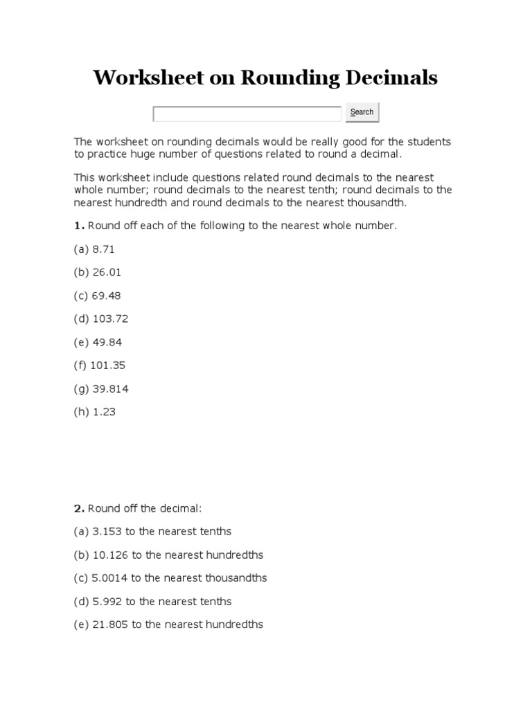 Rounding Decimals - Worksheets - Super Teacher Worksheets On these worksheets, students will round decimal numbers to the nearest tenth, hundredth,, thousandth, or nearest whole number. Most of the worksheets on this page are common core aligned. Nearest Tenth Rounding to Nearest Tenth: Runners FREE Round the numbers to the nearest tenth. Then answer two word problems related to Olympic runners.
