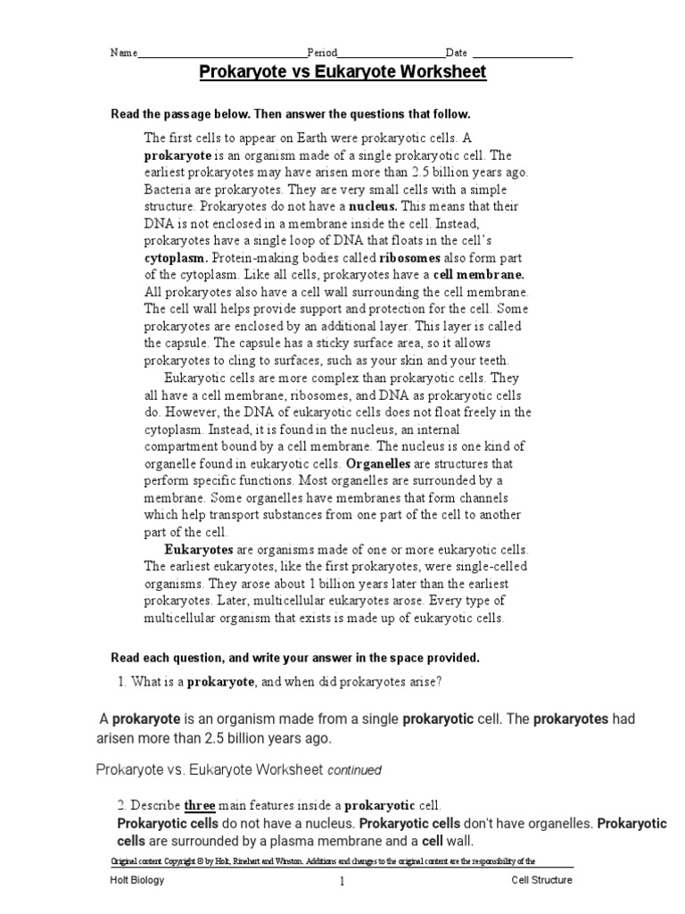 Cell biology prokaryotes and eukaryotes worksheet answers
