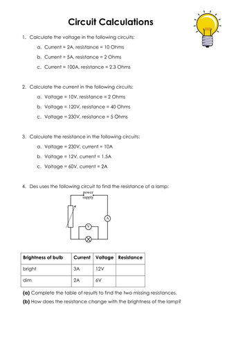 Calculate Current Resistance And Voltage Worksheets - Learny Kids Displaying top 8 worksheets found for - Calculate Current Resistance And Voltage. Some of the worksheets for this concept are Circuits work, Physics work lesson 19 electric circuits, Voltage divider circuits ac electric circuits work, Grade 9 science unit 3 electricity, Section 6 current voltage and resistance in parallel and, Electricity exam type questions, Igcse physics circuits ...
