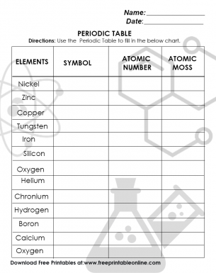 periodic table of elements worksheets Order results: Periodic Table of Elements. by larsej01. PeriodicTable of Elements. by Nykeidardurham. 6.1 classification of elements. by CikguFhatin. Periodic classification of elements. by umanageswari. Periodic Table Worksheets - TheWorksheets.CoM - TheWorksheets.com The Periodic Table Directions: Use Chapter 4 Section 2 and the Periodic Foldable to complete this worksheet. I. List the atomic numbers Of the elements in Period 2. 2. List the symbols of the elements in Period 2. 3. Name the elements in Period 2 that are metals. 4. Name the elements in 2 that are nonmetals. DOC Periodic Table Worksheet - Fleming County Schools Periodic Table Worksheet Tell which element is located in the following groups and periods. __________ group 4, period 5 __________ group 2, period 2 __________ group 6, period 6 __________ group 18, period 1 __________ group 14, period 5 __________ group 12, period 4 __________ group 1, period 7 __________ group 16, period 6 Free Printable Blank Periodic Table Elements Chart [PDF] We have a collection of the printable periodic table in excel file, pdf, PNG image format, etc. This table contains the accurate date of the name of the elements, their atomic weight, symbol, atomic number, and electronic configuration. These all data are obtained from the IUPAC that is an international union of pure and applied chemistry.