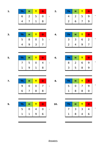 4-Digit Number Subtraction Worksheet (Teacher-Made) - Twinkl The worksheet is differentiated to begin as 4-digit subtraction with no exchanging, gradually building to 4-digit subtraction with exchanging (sometimes known as regrouping or borrowing), missing number problems and finally 4-digit subtraction within word problems. While the resource is perfect for Year 4 lessons on formal written methods for ...