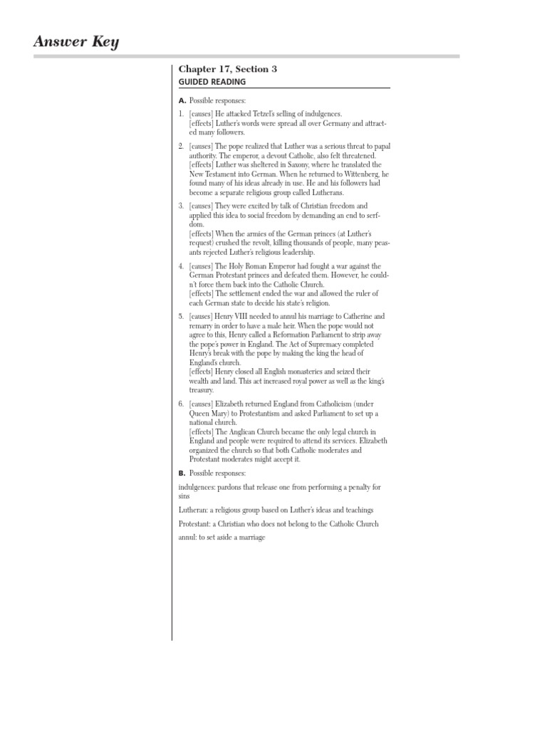 Luther leads the reformation worksheet. Luther Leads the Reformation Flashcards - Quizlet Study with Quizlet and memorize flashcards containing terms like In 1517, Luther posts his 95 theses on the church door at Wittenberg. 17.3 Luther leads the reformation Flashcards - Quizlet movement for religious reform. Lutherans. people who followed Martin Luther and his teachings. protestant. term applied to Christians who belong to ... Luther Leads the Reformation Luther Leads the Reformation. Key Terms and People. Martin Luther German monk whose protests against the Catholic Church led to ... Guided Reading Workbook ... GUIDED READING Luther Leads the Reformation Clarifying On the back of this paper, define each term: indulgence, Lutheran,. Protestant, and annul. CHAPTER. 17. Causes. Event or Situation. Effects. 1. In ...