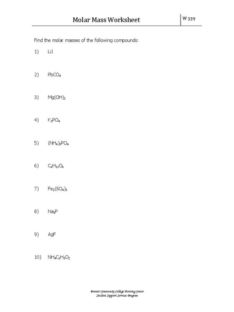 › w339-molar-mass-worksheetMolar Mass Worksheet - Everett Community College Molar Mass Worksheet W 339 Everett Community College Tutoring Center Student Support Services Program Find the molar masses of the following compounds: 1) LiI 2) PbCO 4 3) Mg(OH) 2 4) K 3 PO 4 5) (NH 4) 3 PO 4 6) C 6 H 12 O 6 7) Fe 2 (SO 4) 3 8) Na 3 P 9) AgF 10) NH 4 C 2 H 3 O 2