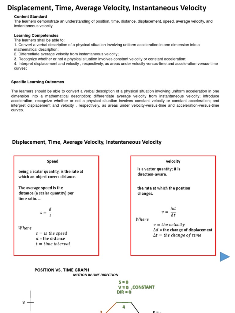Motion in One Dimension Notes/Worksheet - Topic 2.1 - IB Physics Velocity is the change in position over the change in time. Velocity is displacement over time. (Vector Quantity) Speed is the length of the path followed over time. Speed is the distance over time. (Scalar Quantity) In uniform motion the speed/velocity is constant. (by definition) Suppose that at t = 0, s = initial position.