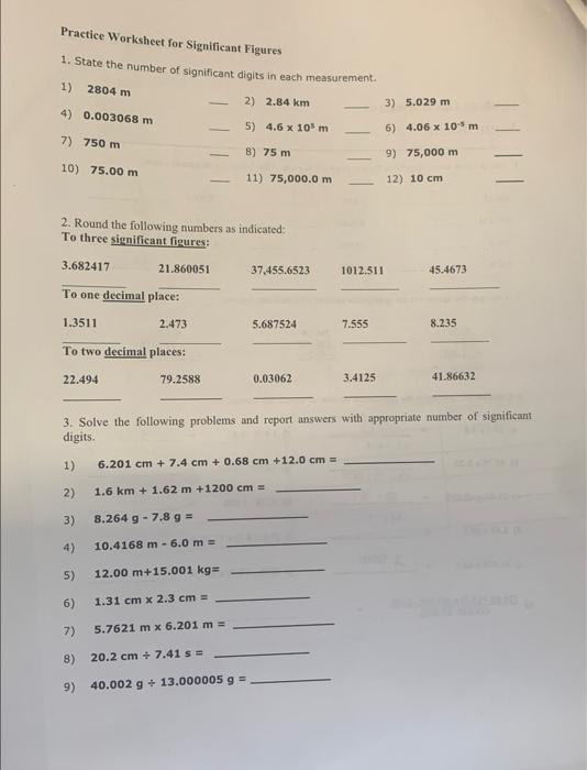DOC Practice Worksheet for Significant Figures Practice Worksheet for Significant Figures 1. State the number of significant digits in each measurement. 1) 2804 m 2) 2.84 km 3) 5.029 m 4) 0.003068 m 5) 4.6 x 105 m 6) 4.06 x 10-5 m 7) 750 m 8) 75 m 9) 75,000 m 10)