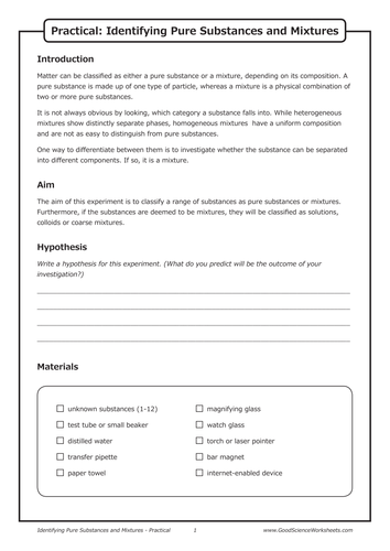 Pure substance or mixture worksheet Pure substance or mixture worksheet Live worksheets > English > Science > Pure substances and mixtures > Pure substance or mixture Pure substance or mixture pure substances and mixtures ID: 1272913 Language: English School subject: Science Grade/level: 3ยบ Age: 7-9 Main content: Pure substances and mixtures Other contents: Add to my workbooks (107) Pure Substances vs. Mixtures worksheet.pdf - Google Docs Pure Substances vs. Mixtures Name: Period: For the following: On the first blank write if the example is a pure substance or mixture. If it is a pure substance, then on the second blank write if... Pure Substance Vs. Mixture - Liveworksheets Pure Substance Vs. Mixture worksheet Advanced search English - Espaรฑol Home About this site Interactive worksheets Make interactive worksheets Make interactive workbooks Help Students access Teachers access Live worksheets > English > Science > Properties of matter > Pure Substance Vs. Mixture Finish!! More Science interactive worksheets